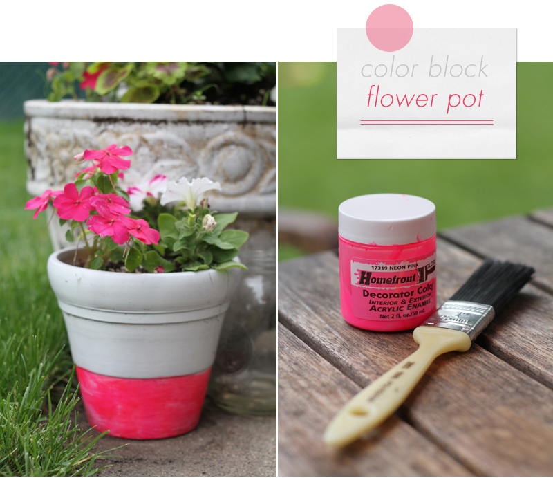 For Cam’s shower I needed to bring my pink game, so I was all about finding easy ways to have pink shades show up all around my garden. A super easy thing to do is go in your garage and grab an old clay pot or two, or three, or ten, and spray paint them white. Then with a $3.50 jar of neon pink paint, paint the bottom for instant color-blocking-coolness . Fill those suckers with flowers and you have an quick and easy centerpiece for less than the cost of a bouquet of flowers.