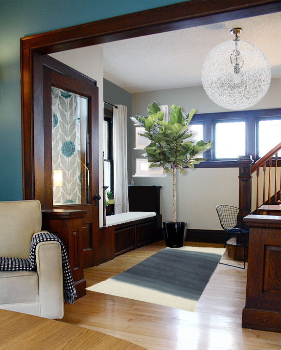My biggest problem in the entry way is that long window near the stairs. I obviously couldn’t hang curtains on it because one side of the window is set above the staircase. My attempt of adding fabric pennant bunting was cute, but not a long term solut-sch. The window is pretty, and there is a simple leaded glass pattern that runs through out it, but it so bare. I’ve had a serious crush on Fiddle Leaf Fig trees forever now, and I think the corner of the entry might be the perfect place for one. (Isn’t that convenient??) As the tree grew it would work as a natural window covering. I think I seriously might be on to something here. Not only that, but I am dying for more green in my house… you know these dark winter months are getting me down.