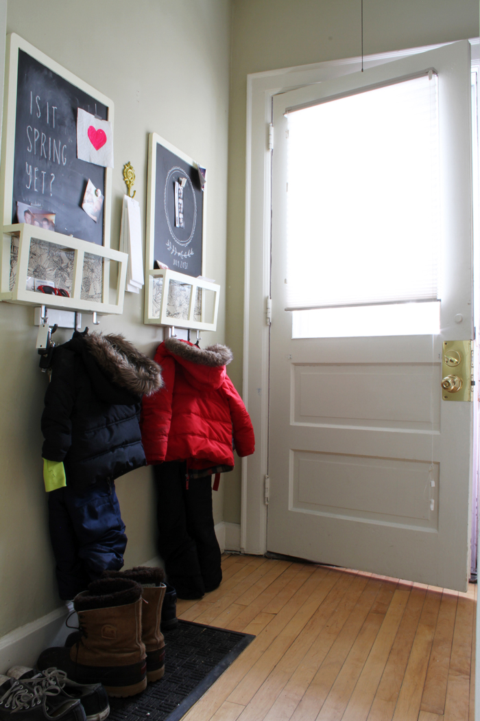 Under the chalkboards I hung two sturdy hooks for Finn and Gus. Both are at their level so they can get in the habit of hanging up their jackets and snow pants, which only one of them excels at. Also, you will see we have a rubber mat for all our boots and shoes. No more than one pair per family member is allowed!