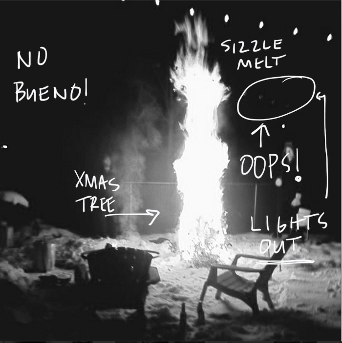 Over the winter, my old man and I did something pretty dumb. Let me start by saying we had really good intentions. We wanted to make a new annual Allen Christmas tradish and burn down our Christmas tree the day after New Year’s day, duh. It sounded like a cool and fun idea, and it made for a good excuse to drink some brews and have a winter fire in the backyard. I tried to think responsibly and logically about this; I knew the Christmas tree was dry, so I figured I’d cut it into quarters, and we could burn it in sections to minimize the blaze. That sounds reasonable to me. Unfortunately, even quartered dried-up pine trees like to burn fast and huge no matter what, like in a almost burn your house down sort of way. See below: