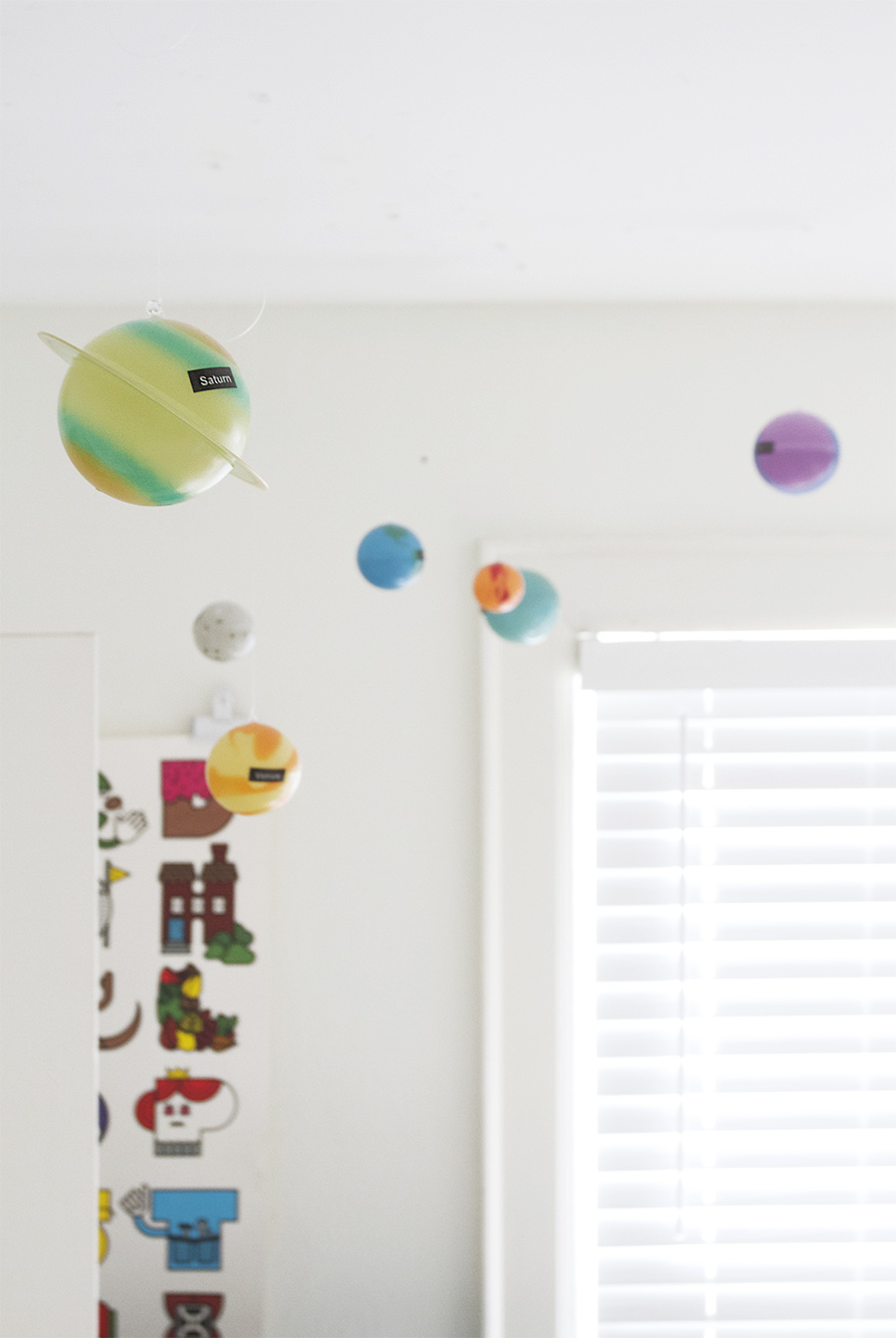 Keeping the walls white made it easy to add lots of colors with all the kids toys n’ stuff. These are Finn’s planets. He loves space, and black holes, and Neil deGrasse Tyson and all that stuff so much.