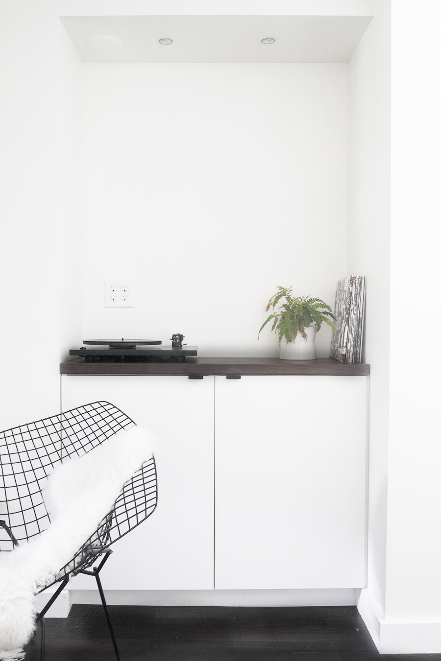 Regarding the turntable, I got it from upstairs ;) It’s just our day-to-day turntable. I’m lucky, my dad is an audiophile and I got this hand-me-down rega turntable about 10 years ago (here’s the modern equivalent of our model). We love it and I’d definitely consider investing in another for the basement OR upgrading the upstairs turntable and keeping this one in the basement. Either way, it’s been great.