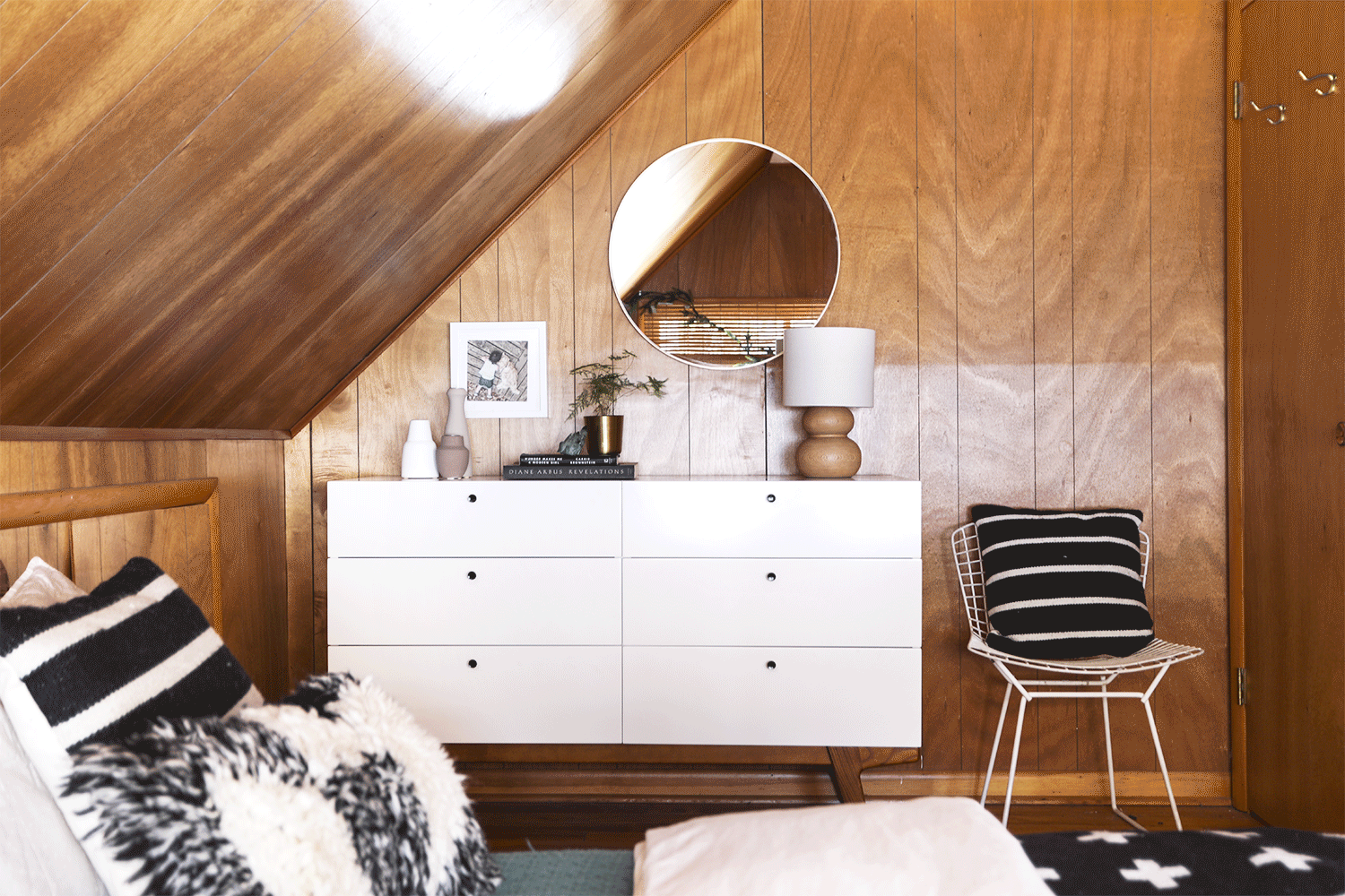 White ANYTHING is my secret weapon when it comes to combating the charming, but sometimes overpowering, wood tones in the cabin. White neutralizes, and adds contrast and I love the look of this modern dresser against the walls!
