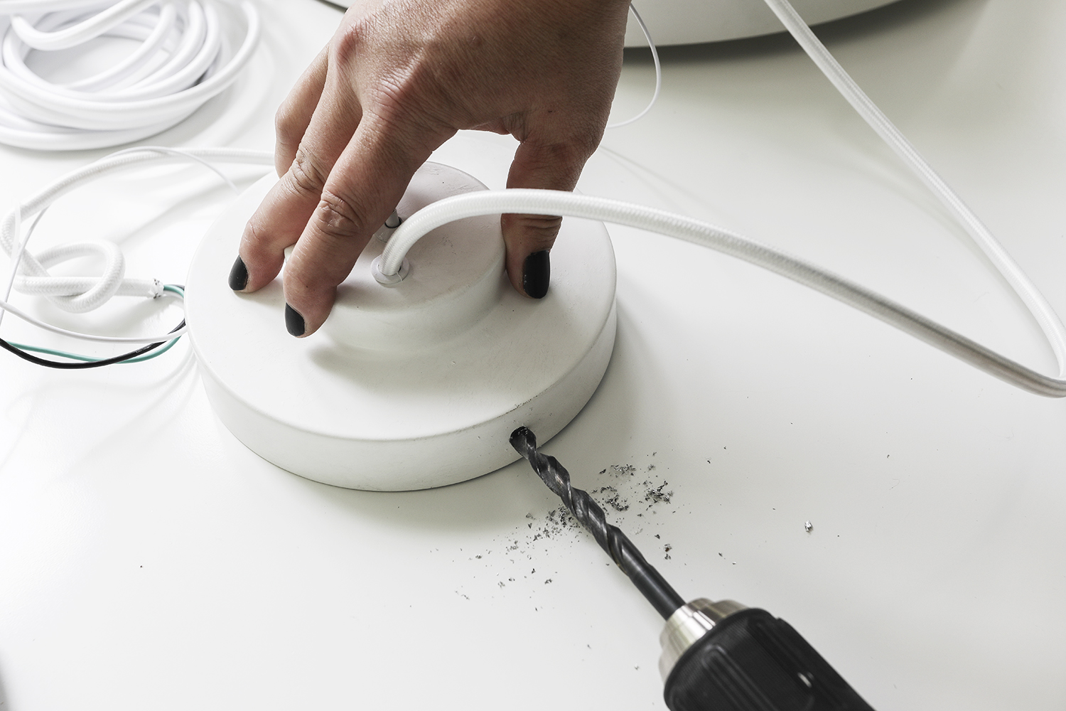 Use a 3/8 drill bit (for metal applications) to drill a hole through the canopy of the pendant.