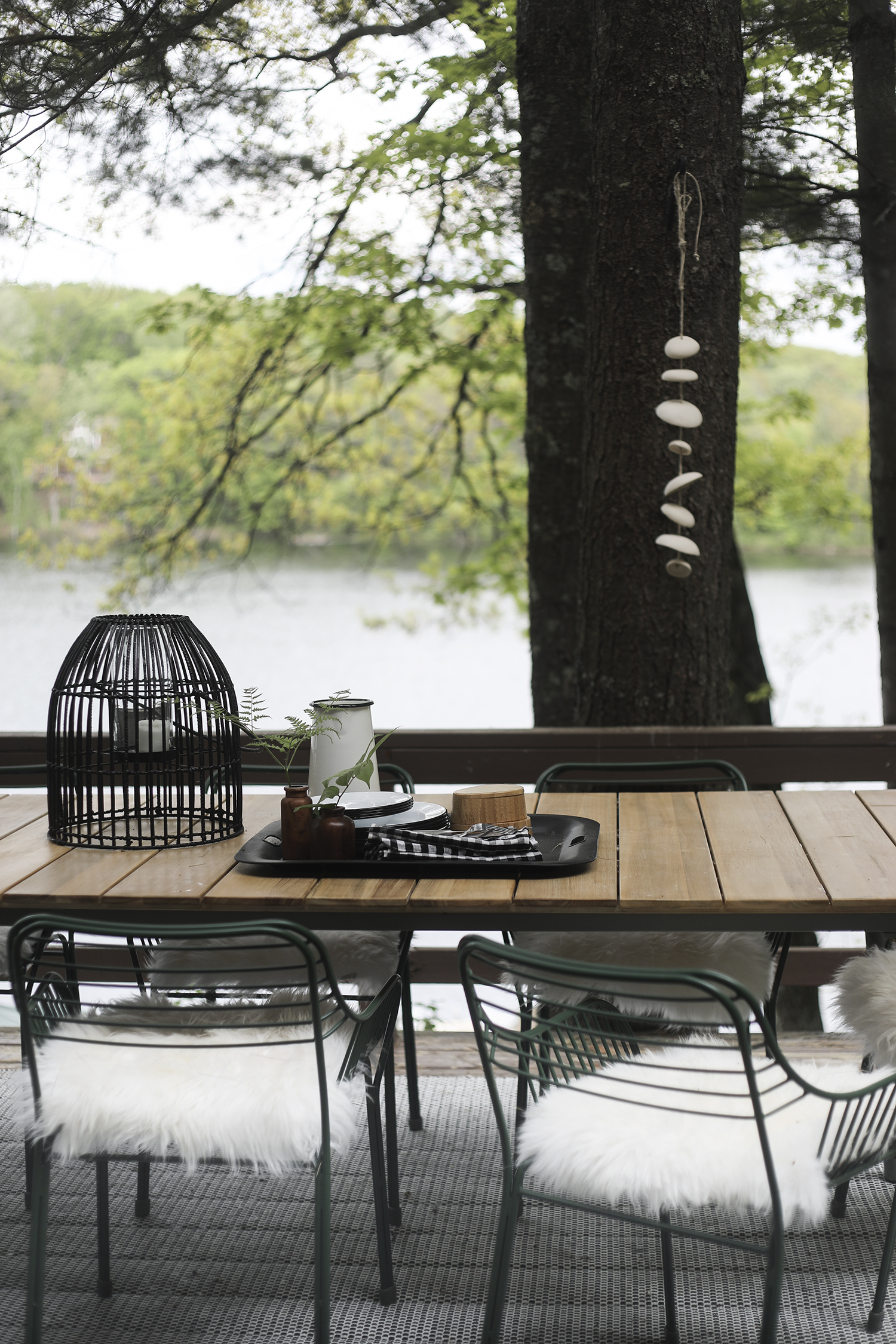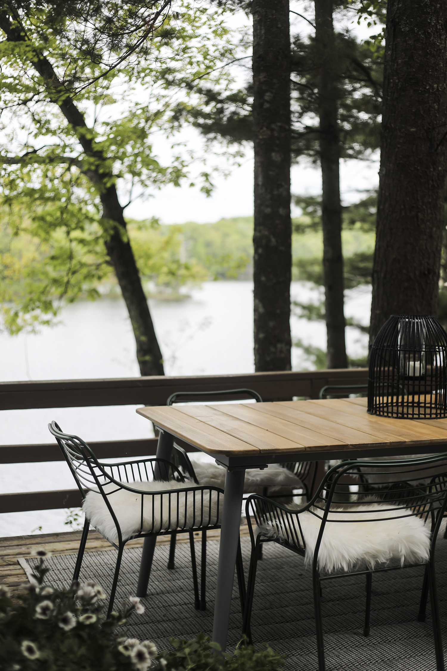 I had a few requirements when it came to choosing an outdoor dining set for our cabin deck. I wanted it to fit at least 8 easily, the space is big enough that we can fit a large amount of people around the table, and since we are often hosting guests, we needed to have a large table to do so. I also wanted to have the furniture be non-invasive, which is a weird requirement, I know. What I mean by that is that I didn’t want it to be so chunky and oversized that it would block our view of the lake from inside our cabin. I also wanted it to look modern and minimal, with a nod to Scandinavian aesthetic which has been a repeating inspiration for the rest of the spaces in our cabin. It’s a good look to outline your requirements before you begin the hunt for your outdoor furniture.