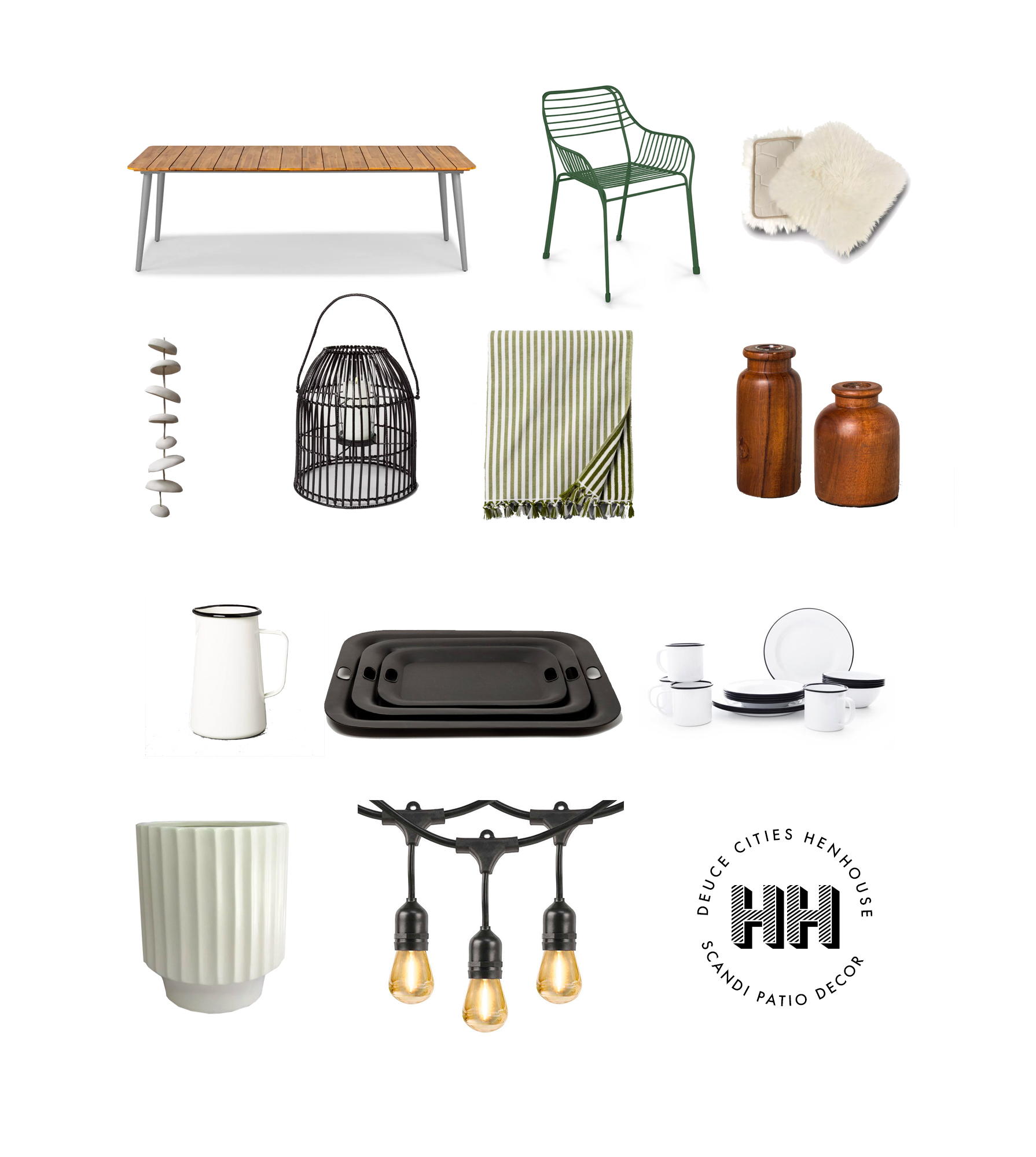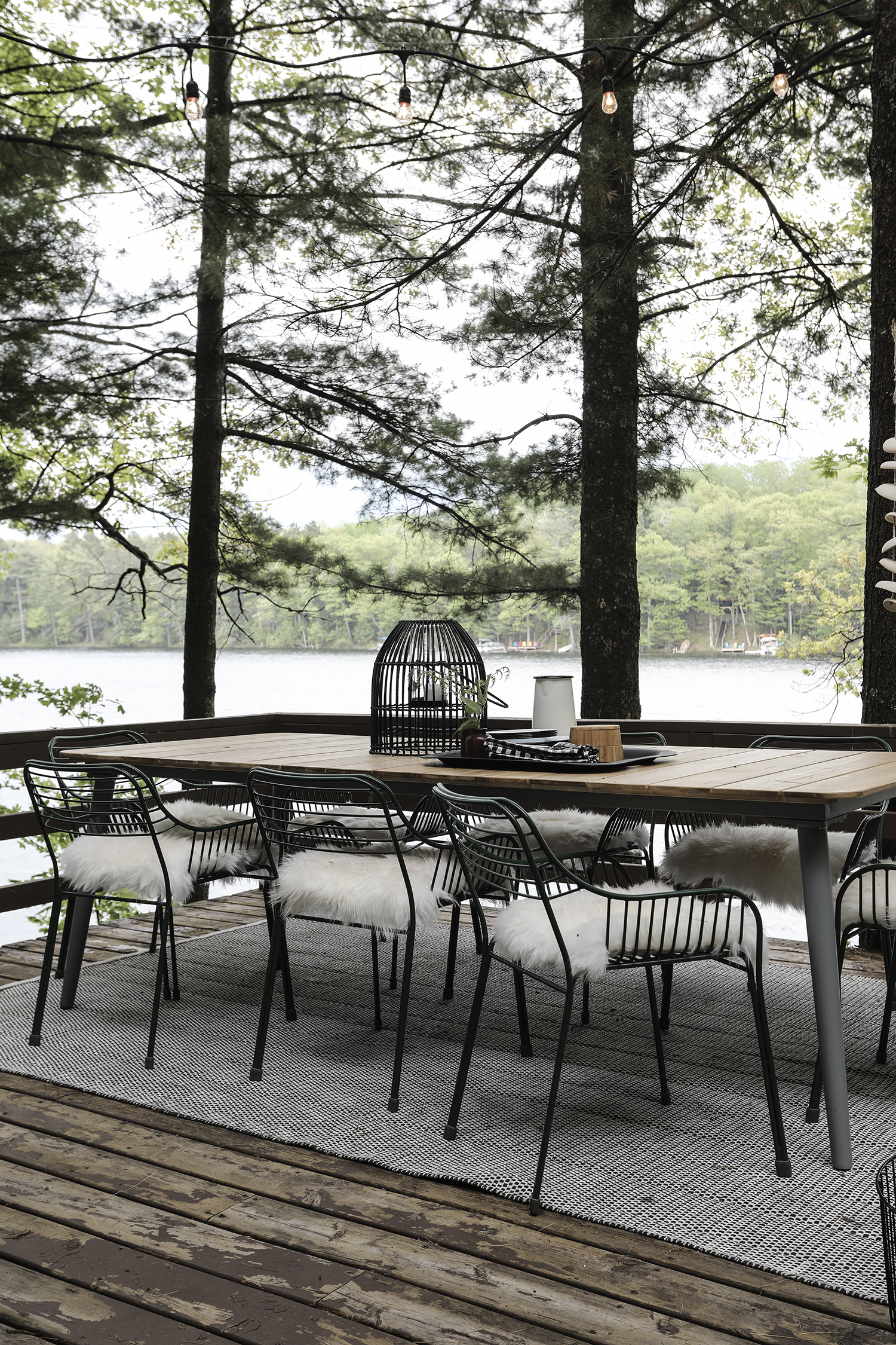 Just like on your interiors, pillows make a space feel cozy and allow you to add new textures, colors or graphic elements very easily. This is key. At the cabin I like to throw around a lot of green or buffalo check pillows – they do the trick and allow spaces that are using similar elements to feel related to one another. Cushions are also key for outdoor hangs. No one wants to sit their butt down on a cold surface, you need to get your budz a cushion! I love how the Lanna sheepskin cushions I used for the metal Caya chairs provide comfort, a cozy element, and repeat a texture found inside our cabin.
