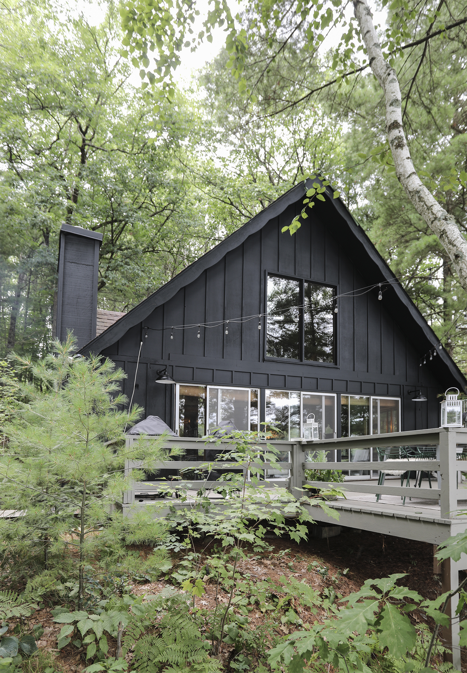 Today I’m sharing the cabin’s new dark lewk (that’s cool to say still, right?)! As it seems to be with all trades people in northern Wisconsin, nothing happens when they say it’s going to happen. The cabin was supposed to be painted in June, and here we are in September still waiting for a few punch list items for our contractors to complete before it’s really done, done. For instance, we are still waiting on the front door AND if you have a keen eye, you may be able to spot a few places that the painter forgot to remove the painters tape from. I just couldn’t wait anymore, and wanted to fill yas in on where we were at.